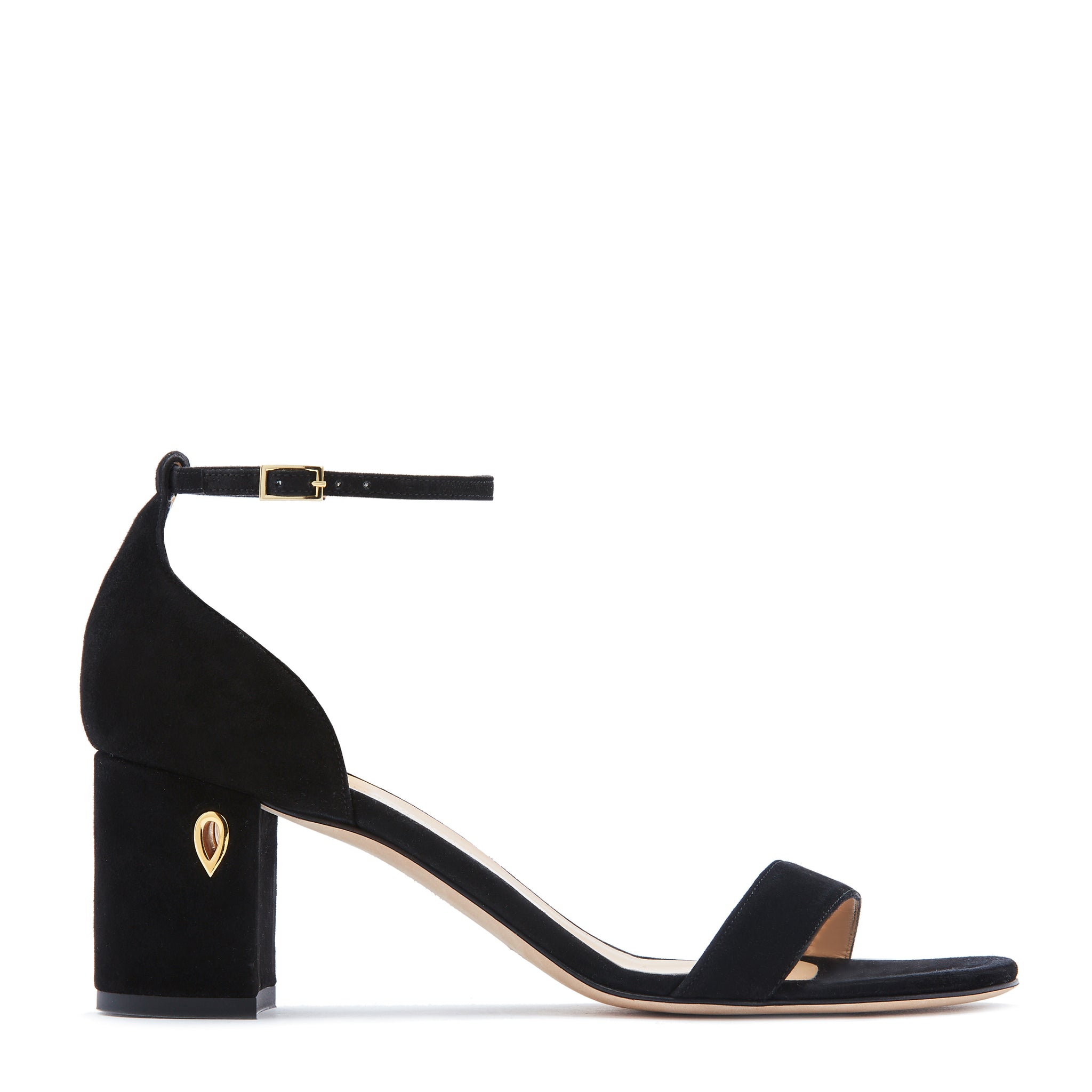 Introducing Jennifer Chamandi’s first block heel sandal. The"Eye Of The Needle" detail on the block heel gives this pair a distinctive aesthetic. Flawless black suede is handcrafted by Italian artisans into a comfortable and balanced ankle sandal with a 65mm heel—the perfect height for practical sophistication from day to night.